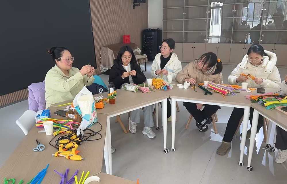 活动伊始,老师现场示范,细致讲解,在老师的指导下,同学们纷纷动手实践。大家充分发挥想象力,将不同花材巧妙组合,制作出风格各异的花束。以及发挥创造力将普通的纱线通过编织、缠绕、装饰等工序,变幻成一个个独具特色的发圈。在制作过程中,同学们相互分享创意和技巧,现场气氛热烈而温馨。大家纷纷表示,通过参与活动,不仅收获了亲手制作的手工制品,更在忙碌的学习生活中获得了一段愉快的体验。