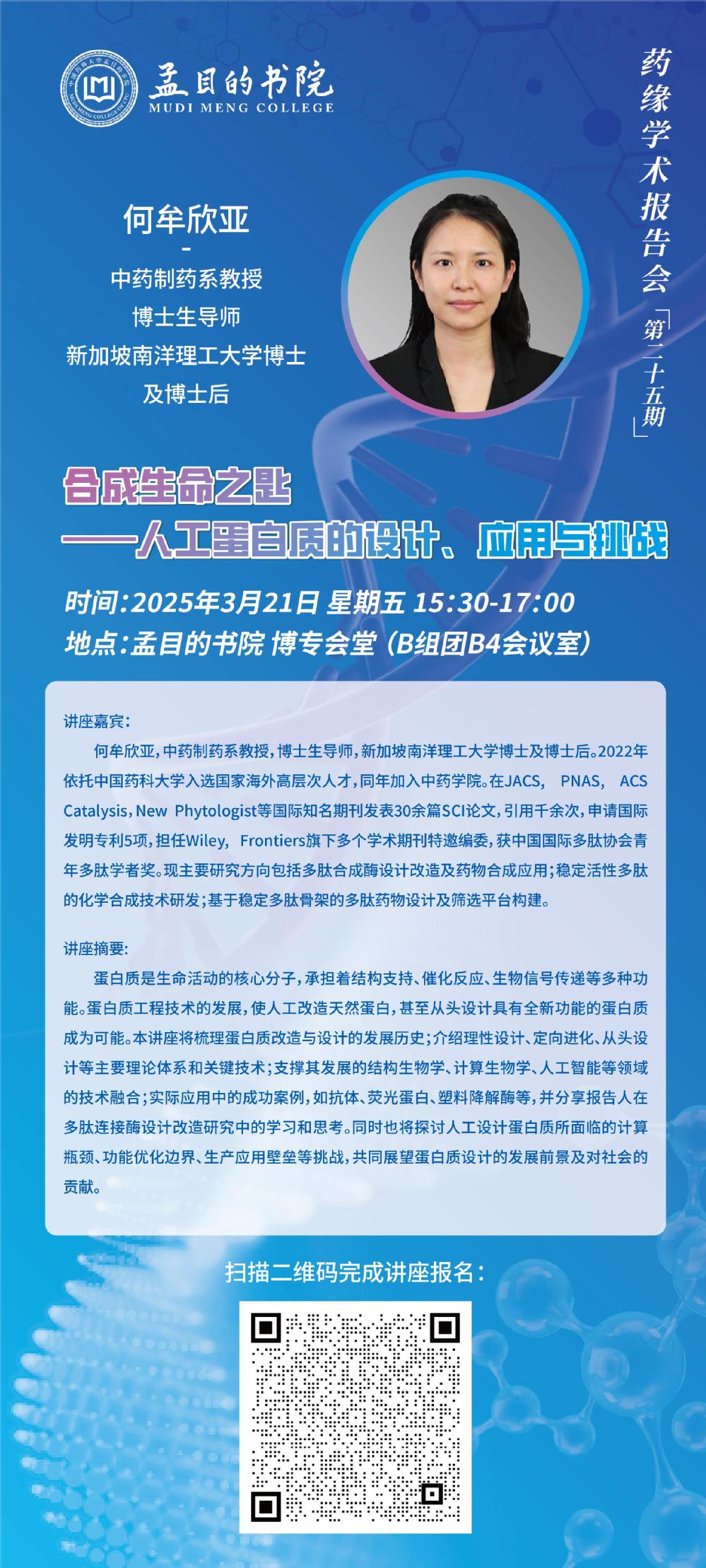 讲座预告|合成生命之匙——人工蛋白质的设计、应用与挑战