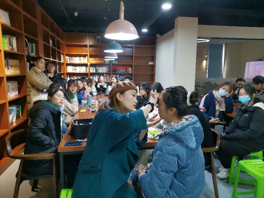 活动分为理论课和实践课两个部分,理论课环节,努尔老师从护肤妆容和服饰着装两个方面介绍了老员工平时应注意的社交礼仪和仪容仪表,以帮助同学们更好地打造个人形象,提升自身气质。实践课环节,努尔老师响应同学们的需求,以一名同学为模特向大家展示并仔细讲解了日常妆容及搭配步骤与操作要点。展示讲解完毕后,努尔老师指导同学们利用本活动提供的美妆工具尝试给身边的同学化妆,让同学们明白美妆工具的选取与妆容风格打造因人而异,且化妆技能需要在练习中提升。同学们通过此次实践逐步深化了对美和妆容、形象与气质的理解。