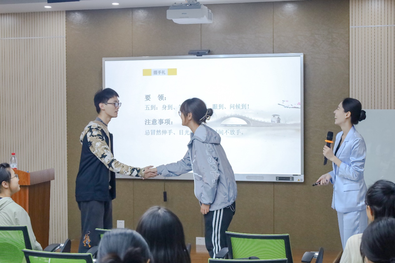 陈瑶老师从什么是“礼”谈起,向大家讲解了礼仪的重要性,传达了“人无礼,无以立”、“礼仪能更好帮助传达思想、文化”的理念。随后,她从仪容、仪表、仪态三个方面向大家展示了不同时间、地点、场合下的礼仪规范,并邀请同学上台展示,讲座内容生动有趣、现场气氛热烈。